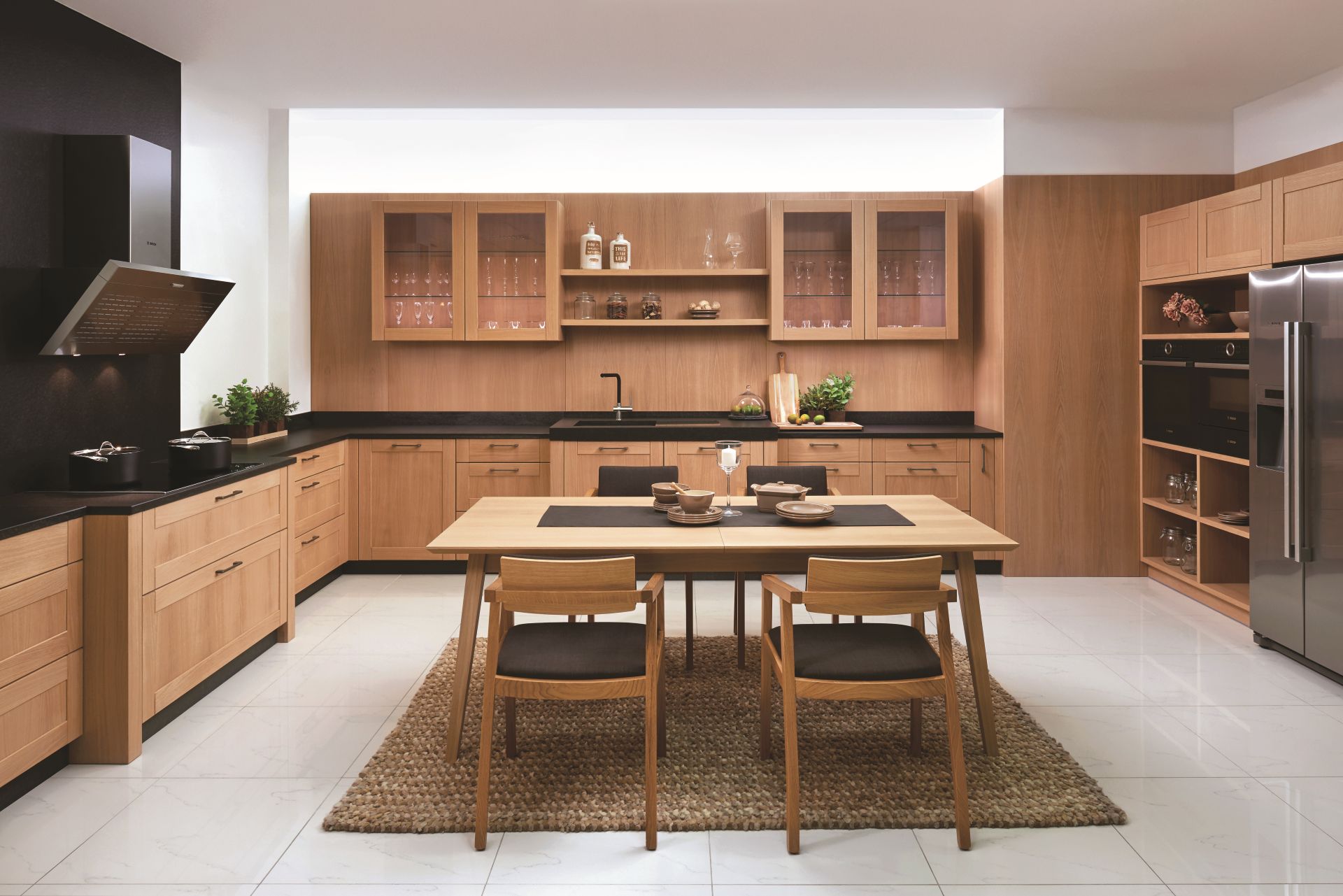 Orámování dvířek je velmi decentní. Jednoduchá úchytka plní praktickou funkci a nijak neruší vzhled kuchyně. Všimněte si vnitřního organizéru. Je nejen praktický, ale také krásný už na první pohled.